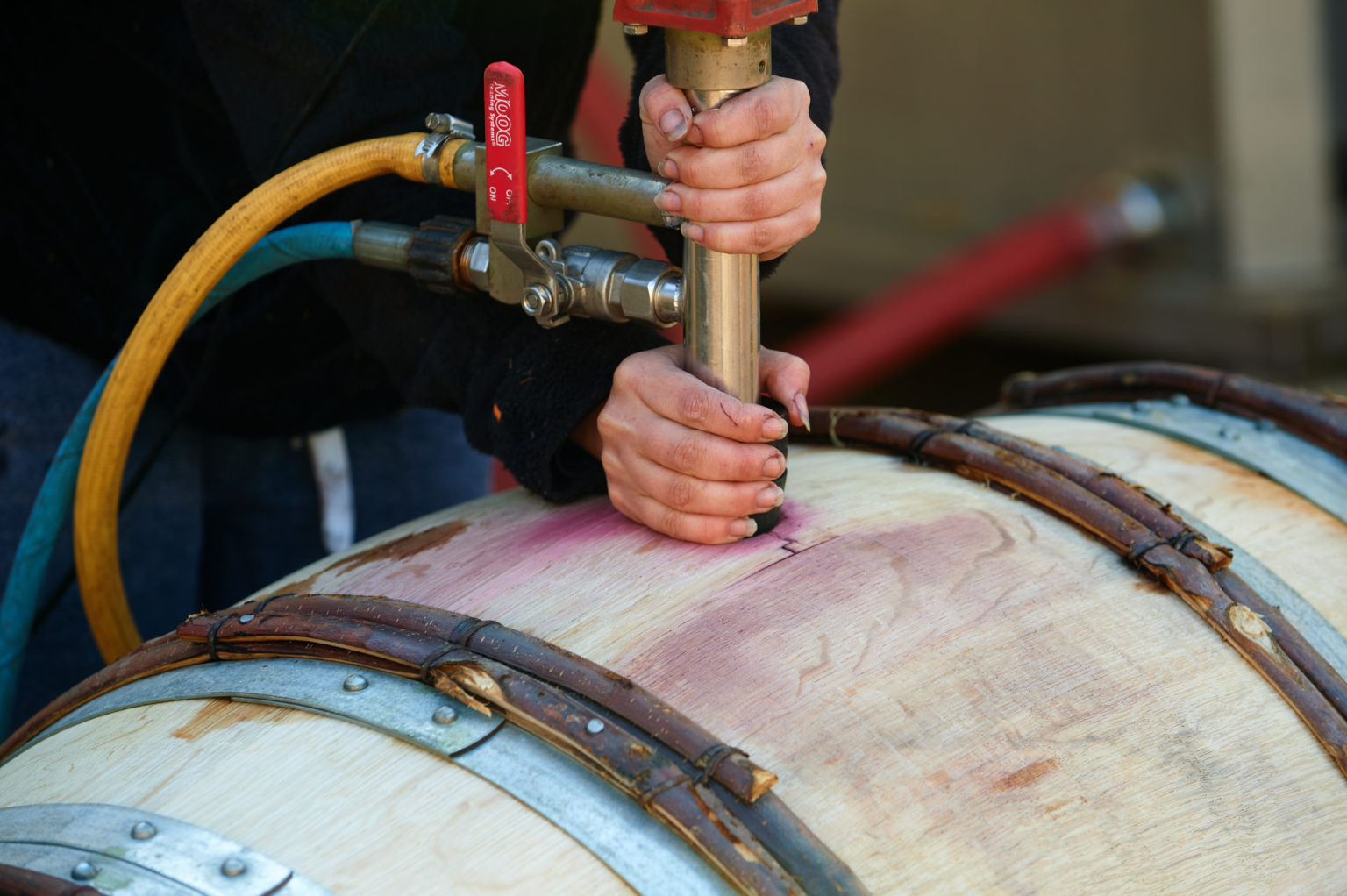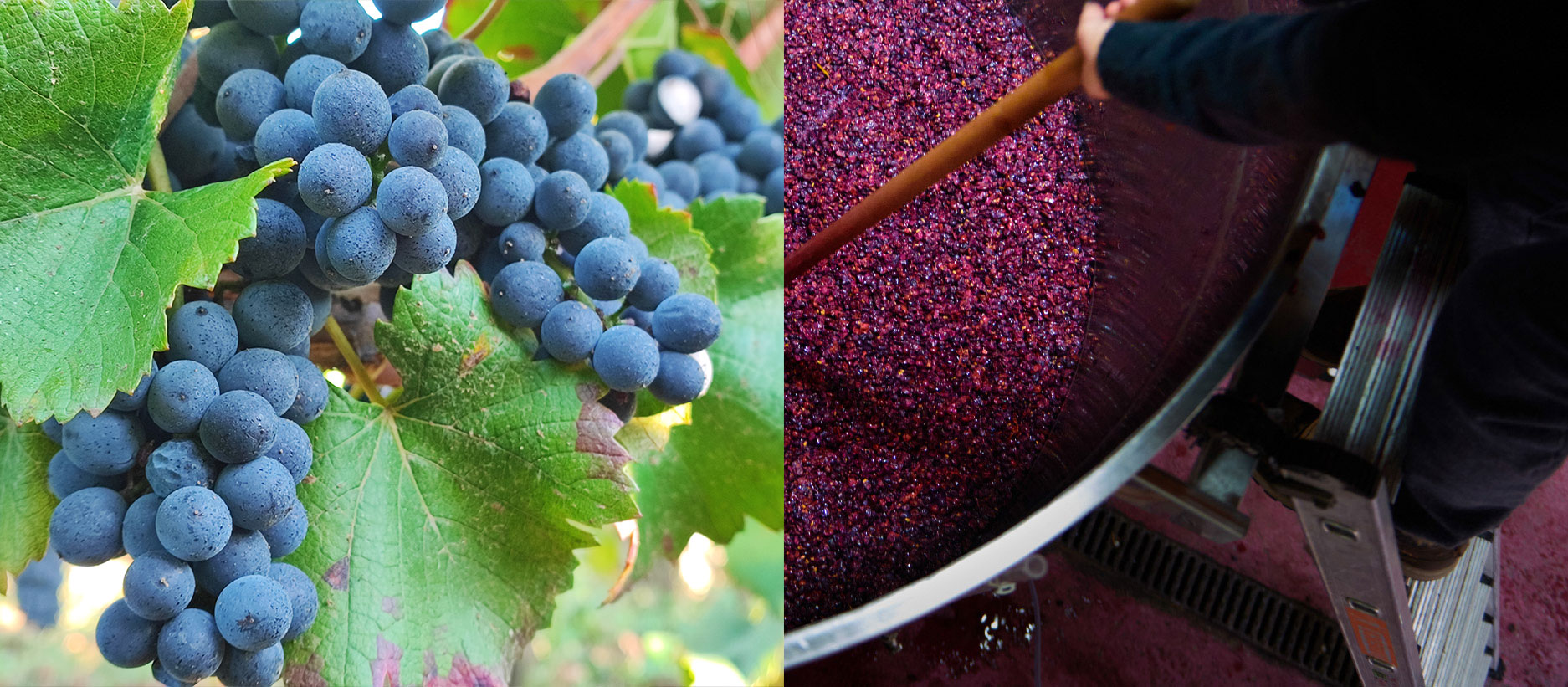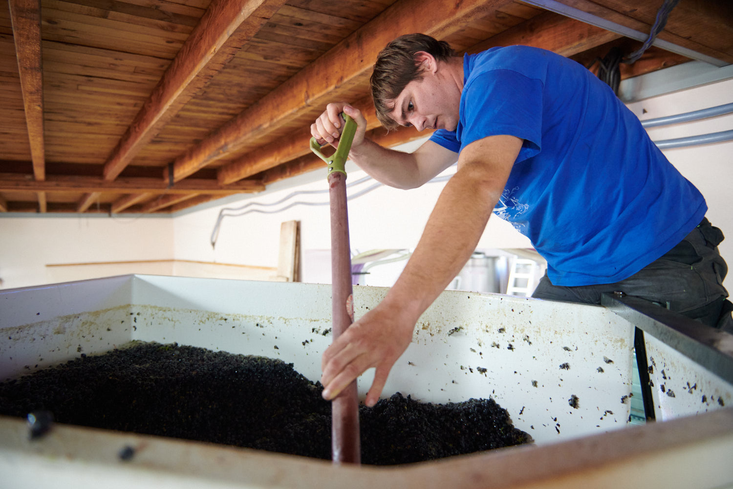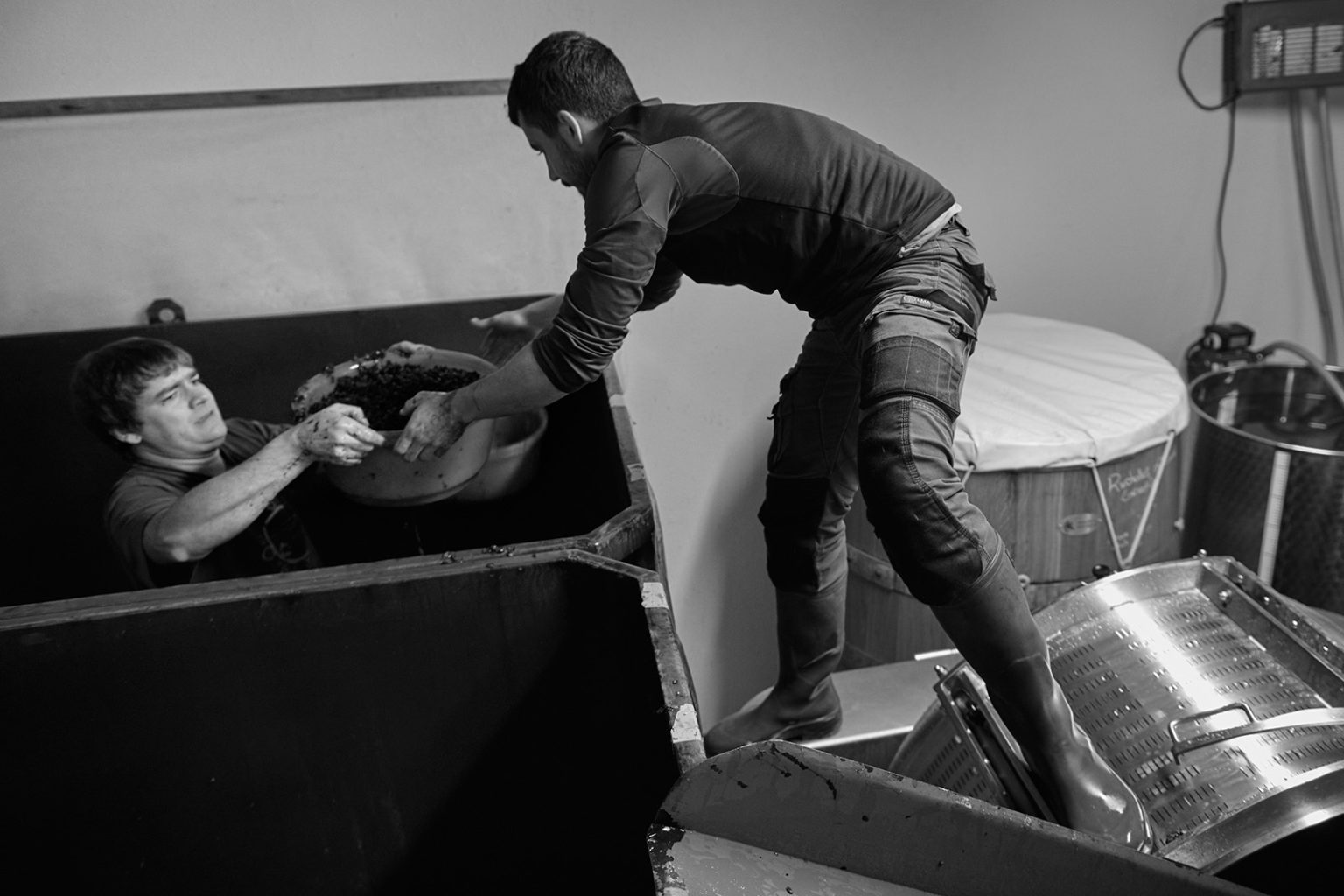 Lors de la vinification, après une semaine de macération pelliculaire pré fermentaire à froid, la fermentation alcoolique débute d’elle-même. Deux techniques incarnent les seules actions pratiquées permettant d’extraire les composés phénoliques, la couleur rouge données par les anthocyanes, les tannins pour la structure et les arômes : le pigeage, ainsi que des remontages, qui sont plus doux, sous l’attention aiguisée et permanente d’Etienne ainsi que de tous les membres du domaine. Aucun intrant ne sera ajouté dans les cuves, car la culture raisonnée de la vigne ne s’arrête pas aux portes de la cuverie. Les levures sont indigènes, présentes dans la vigne et dans la cuverie, ce sont elles qui transformeront le jus de raison en vin.